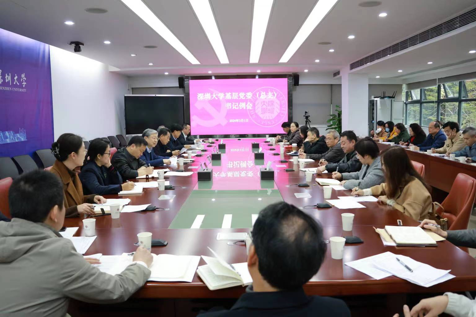 2024年3月1日上午,深圳大學在匯元樓201會議室召開基層黨委(黨總支)書記例會。校黨委書記李清泉主持會議,黨委副書記、紀委書記王月興,黨委副書記吳報水,副校長汪永成,各基層黨委(總支)書記、機關職能部門和直屬單位負責人參加會議。