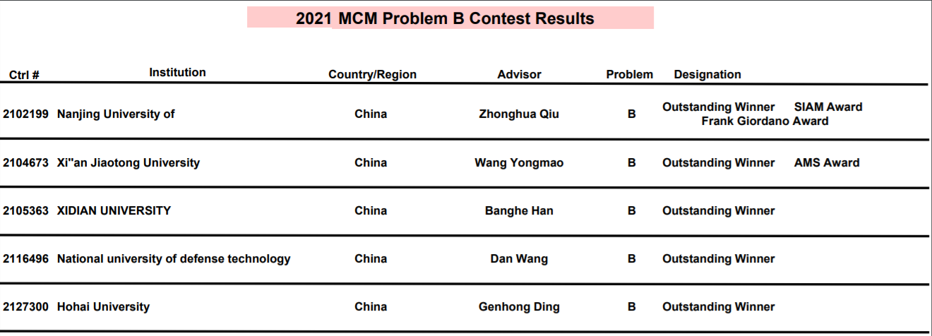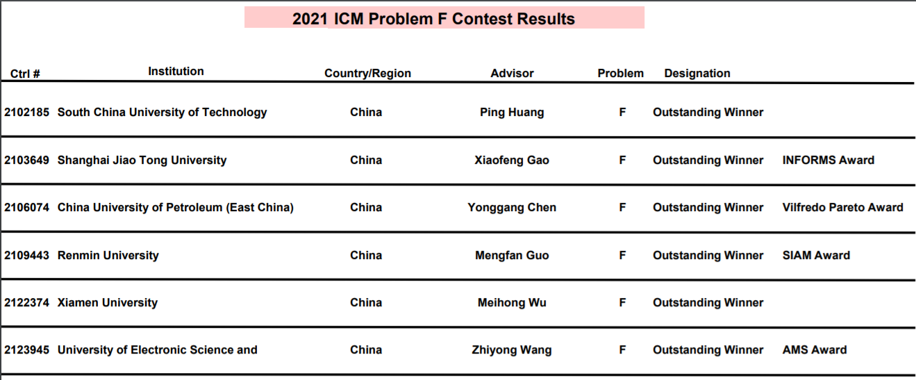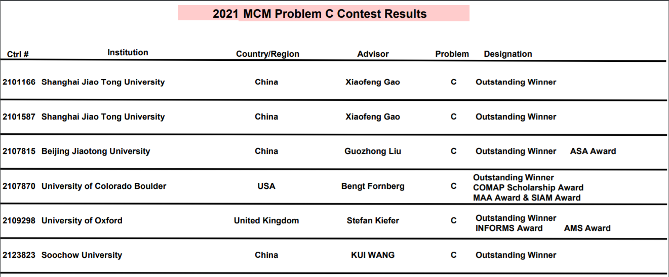 附:2021年美賽獲獎數(shù)據(jù)(引用自美賽官網(wǎng):https://www.comap.com/undergraduate/contests/mcm/contests/2021/results/)