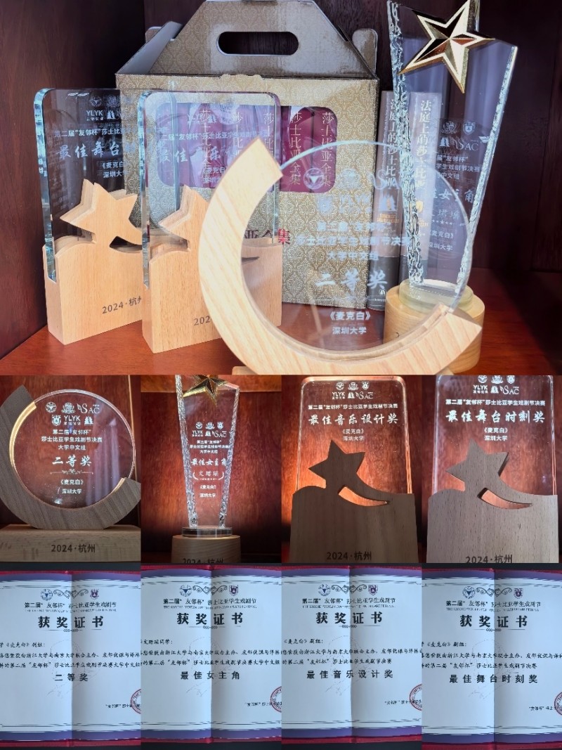 第二屆“友鄰杯”莎士比亞學(xué)生戲劇節(jié)經(jīng)過初賽、復(fù)賽,于2024年9月21日在浙江大學(xué)紫金港校區(qū)舉行決賽并圓滿落幕。深圳大學(xué)藝術(shù)學(xué)部戲劇影視學(xué)院表演專業(yè)2022級學(xué)生文珺瑤與邱德茂表演的作品《麥克白》獲評委會高度好評,作為示范劇目獲評為戲劇節(jié)決賽二等獎、“最佳女主角”、“最佳舞臺時刻獎”、“最佳音樂設(shè)計(jì)獎”等四個獎項(xiàng)。