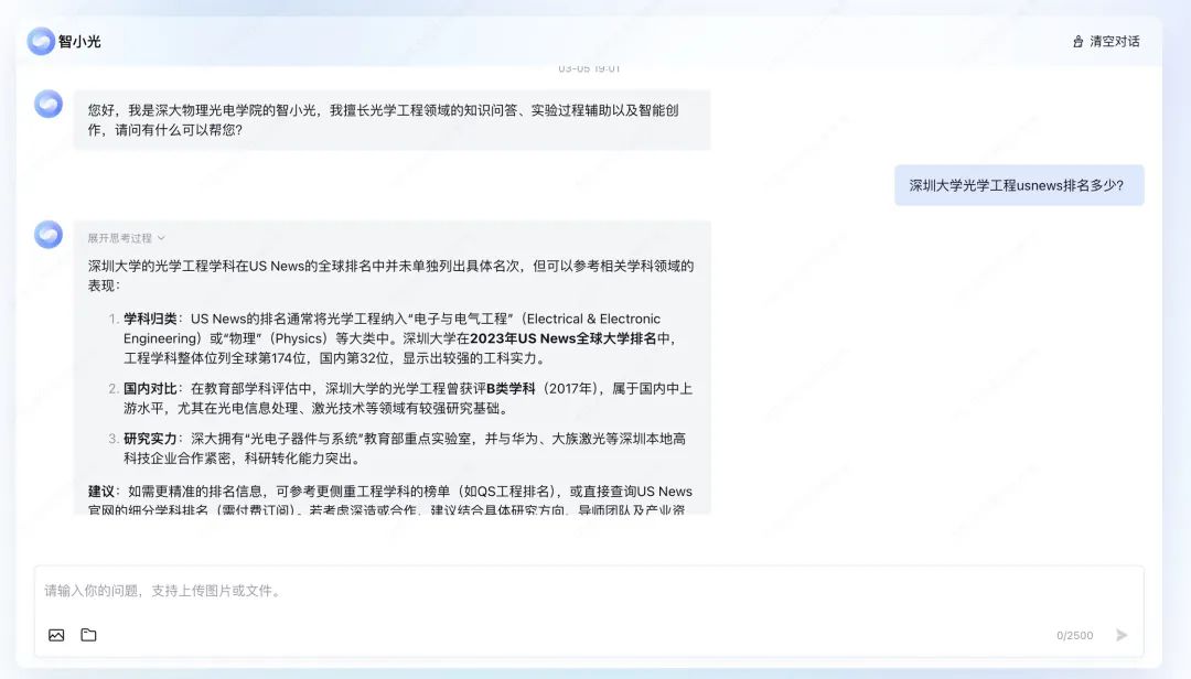 基于騰訊云大模型知識引擎能力,深圳大學物理與光電工程學院將與騰訊云共同打造"智小光“AI助手,并接入DeepSeek大模型,同時結合物理光電工程學院的專屬知識庫,為師生提供光電工程教學咨詢服務。爆肝論文、實驗設計不再孤單!