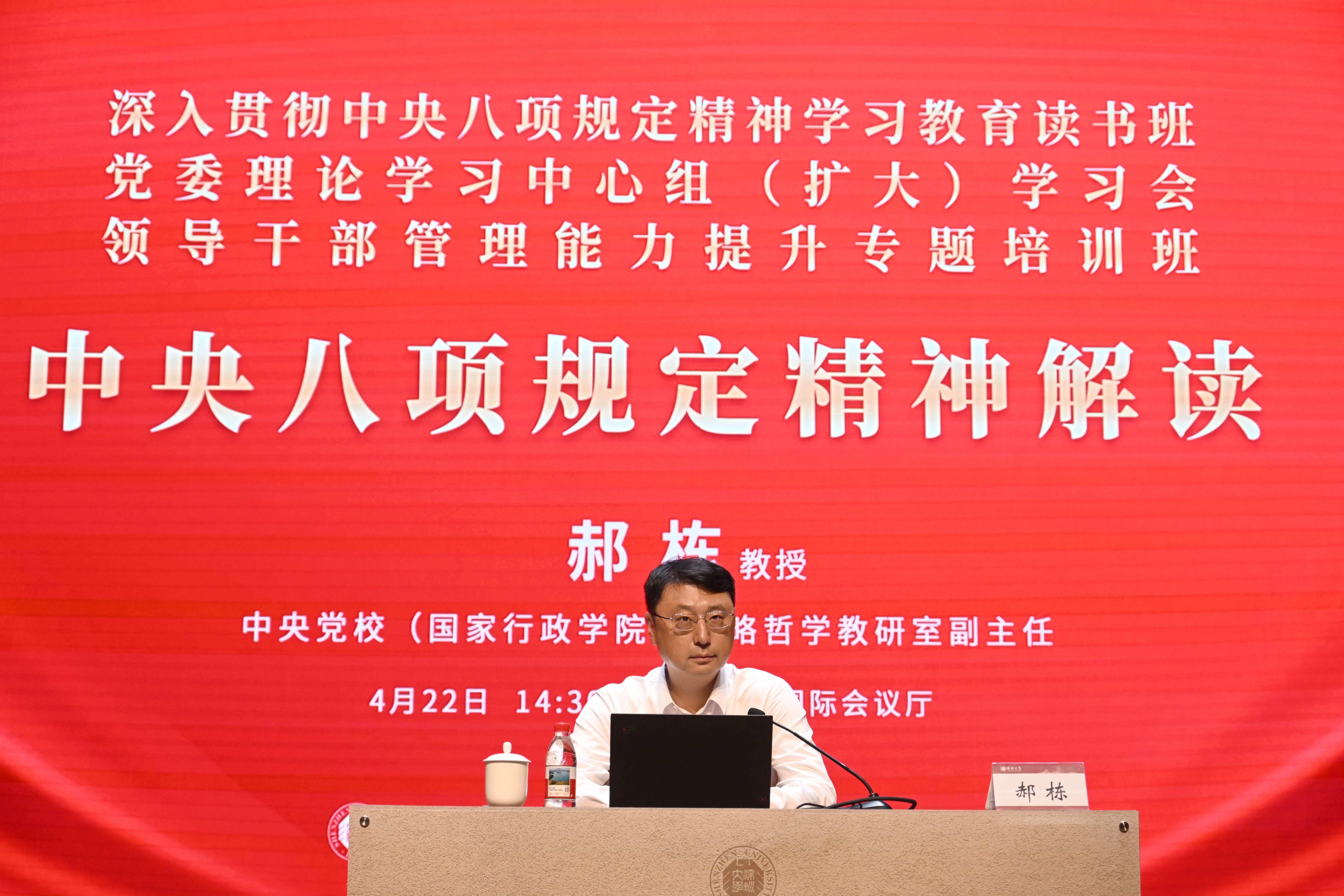 4月22日下午,深圳大學在粵海校區國際會議廳舉辦深入貫徹中央八項規定精神學習教育讀書班暨黨委理論學習中心組(擴大)學習會暨領導干部管理能力提升專題培訓班第二期講座,中共中央黨校(國家行政學院)戰略哲學教研室副主任郝棟教授受邀作“中央八項規定精神解讀”專題授課。校領導、黨委委員、中層領導干部、新聘任七級八級管理人員等共300余人參加學習。黨委副書記吳報水主持學習會。此次學習會也是深圳大學“荔園金聲講堂”和“荔園先鋒大學堂”宣講活動之一。