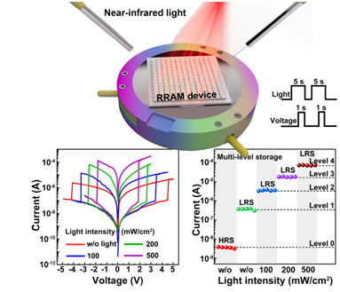 結(jié)構(gòu)簡化,功能化和多樣化是后摩爾時(shí)代電子存儲(chǔ)技術(shù)發(fā)展的主要趨勢。光電阻變存儲(chǔ)器因?yàn)槠浣Y(jié)構(gòu)簡單,易于集成和存儲(chǔ)密度高等優(yōu)點(diǎn),成為當(dāng)前研究熱點(diǎn)。然而當(dāng)前研究主要集中在利用紫外光或可見光來調(diào)控光電存儲(chǔ)器。與紫外光或可見光相比,近紅外光具有較大的生物穿透深度且對(duì)組織無損傷,在植入式和可穿戴柔性電子設(shè)備中具有更光明更廣闊的應(yīng)用前景,然而因?yàn)槠涔庾幽芰枯^小,無法激發(fā)大多數(shù)半導(dǎo)體材料。因此如何利用近紅外光調(diào)控阻變存儲(chǔ)器并進(jìn)而實(shí)現(xiàn)多比特存儲(chǔ)是一個(gè)迫切需要解決的科學(xué)問題。針對(duì)上述技術(shù)問題和挑戰(zhàn),該課題組巧妙設(shè)計(jì)了二硫化鉬和上轉(zhuǎn)換納米顆粒的復(fù)合材料(MoS2–Upconversion-Nanoparticle),并將這種材料應(yīng)用于阻變存儲(chǔ)器中。由于上轉(zhuǎn)換材料可以吸收近紅外光然后發(fā)射可見光,而發(fā)射出的近紅外光可以再次激發(fā)二硫化鉬產(chǎn)生激子;同時(shí)產(chǎn)生的激子可以在二硫化鉬/上轉(zhuǎn)換顆粒異質(zhì)結(jié)界面分離成電子和空穴改變材料導(dǎo)電能力。通過改變近紅外光光照強(qiáng)度,阻變存儲(chǔ)器電阻態(tài)會(huì)相應(yīng)改變,表現(xiàn)出多級(jí)存儲(chǔ)特征,提高了存儲(chǔ)器存儲(chǔ)密度。本實(shí)驗(yàn)不僅填補(bǔ)了利用近紅外光調(diào)控阻變存儲(chǔ)器的空白,而且可以將其應(yīng)用于電子眼等設(shè)備中,為下一代高性能光電存儲(chǔ)器及光電器件的開發(fā)和集成提供了新思路。