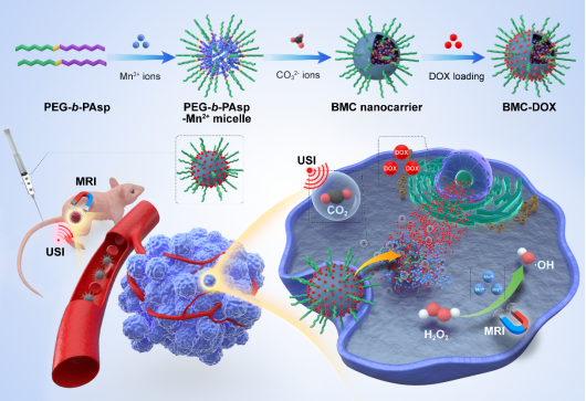 多功能納米診療劑集診斷、治療、以及療效監測于一體,可實現個性化的精確診斷和高效治療。然而,傳統納米診療劑通常是通過集成多種功能組分來設計。該策略不僅增加了材料制備過程的復雜性,而且由于各組分在代謝過程中潛在的毒副作用嚴重阻礙了它們在臨床中的應用。為了克服傳統多功能納米診療劑存在的缺點,黃鵬教授團隊利用聚天冬氨酸(PEG-b-PAsp)為模板,采用原位仿生礦化策略成功制備出碳酸錳礦化的納米載體(BMC)。該納米載體具有較高的生物安全性以及腫瘤特異性響應能力,并在酸性腫瘤微環境中分解釋放Mn2+離子和CO2氣體。其中,釋放的Mn2+離子不僅用于腫瘤磁共振成像監測治療過程,而且通過Mn2+離子介導的化學動力學治療增強腫瘤治療效果;釋放的CO2氣體則用于腫瘤超聲成像。此外,BMC對抗癌藥物阿霉素(DOX)表現出較高的裝載能力以及pH響應的釋放特性。體外細胞實驗結果表明,DOX負載的BMC對乳腺癌細胞具有較好的殺傷效果,并且體內動物實驗也驗證了BMC-DOX具有較好的抑瘤效果。因此,這種組成簡單且生物可降解的BMC納米載體,具有腫瘤特異性激活的特點,具有巨大的臨床轉化前景。