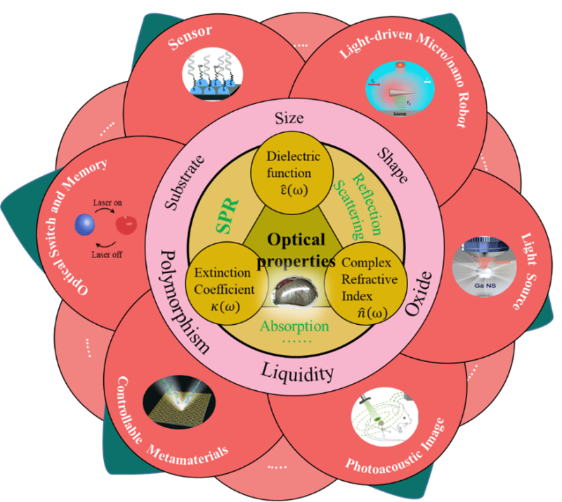 鎵基液態(tài)金屬是一種新興材料,室溫下呈液態(tài),具有流動性、導電性等特點,在軟性電子、化學合成等領域得到了廣泛的研究和發(fā)展,推動現代醫(yī)學和相關工業(yè)快速發(fā)展,例如疾病成像、光熱治療和傳感器檢測等。此外,鎵基液態(tài)金屬由于其獨特的多態(tài)性、過冷現象,可以實現寬帶可調諧的等離子共振,并呈現出特征性的光學響應。然而,盡管現有的綜述已經從光子學的角度總結了鎵基液態(tài)金屬的應用,但在系統(tǒng)介紹鎵基液態(tài)金屬的光學性質及其基本原理方面存在空白。鎵基液態(tài)金屬在光學開關與存儲器、光學傳感器等方面具有廣泛應用。