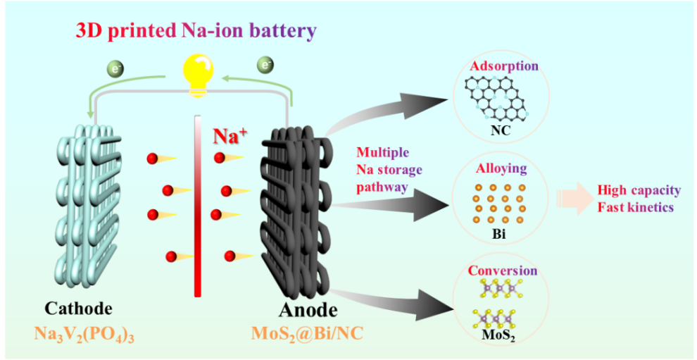鈉離子電池作為最有吸引力的大規模儲能設備之一,需要解決容量與倍率性能之間的權衡問題。本研究將具有混合儲鈉機制的電極材料和高精度電極制備工藝3D打印技術應用于鈉離子電池,設計了一種三元復合物MoS2@Bi/NC,實現了高可逆容量(在0.1 A g-1下為604 mAh g-1,初始輸出為709 mAh g-1)和優異的倍率性能(在15 A g-1下為169.6 mAh g-1)。通過合理設計結構和界面工程,有效地協同了MoS2的轉化型特性、Bi的合金型特性以及N摻雜碳的吸附型特性?;?D打印技術對電極結構精細調控制備鈉離子全電池,負載質量11.7mg cm-2的情況下,1.0 A g-1時具有114 mAh g-1的容量。這項工作將促進3D打印鈉離子電池器件的設計,充分發揮混合儲鈉機制的優勢,為鈉離子電池的制備提供新的思路。
