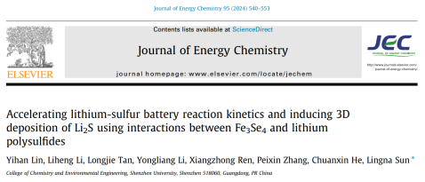 為解決鋰硫電池硫正極的電導率差、穿梭效應、Li2S不可逆沉積和鋰枝晶等問題,孫靈娜教授團隊通過靜電紡絲技術制備了Fe3Se4和多孔氮摻雜納米纖維的復合材料(Fe3Se4@PNCNFs),并將其作為鋰硫電池中間層來改善其電化學性能。研究表明Fe3Se4@PNCNFs對鋰硫電池充放電過程中產生的多硫化鋰中間產物有著較強的吸附和催化作用,能將多硫化鋰保留在正極側從而減弱穿梭效應。除此之外,在鋰硫電池充放電過程中,Fe3Se4會與多硫化鋰反應生成絡合物LixFeSy,其能促進Li2S的三維沉積來增強其可逆能力和倍率性能,這為鋰硫電池的性能改進提供了一條新的路徑和策略。該論文《Accelerating lithium-sulfur battery reaction kinetics and inducing 3D deposition of Li2S using interactions between Fe3Se4and lithium polysulfides》發表在《Journal of Energy Chemistry》(影響因子13.1,中科院JCR 1 區),深圳大學化學與環境工程學院碩士研究生林一涵為第一作者,孫靈娜教授為通訊作者,深圳大學化學與環境工程學院為通訊單位。