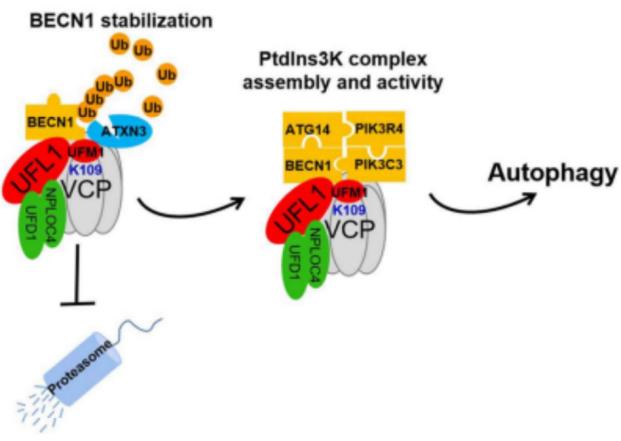 細胞自噬(Autophagy)是真核生物中進化保守的、對細胞內物質進行周轉的重要過程。該過程中一些受損蛋白或細胞器被膜性小泡(自噬小泡)包裹后,與溶酶體(或液泡)融合并降解,從而得以循環利用。自噬過程與癌癥、帕金森綜合征和II-型糖尿病等老年疾病密切相關。猶素(UFM1)作為最晚被發現的類泛素蛋白,已被證明在胚胎發育、內質網穩態、蛋白質量控制、DDR等生命活動中起重要作用,然而在細胞自噬中的功能尚不清楚。在該研究中,許教授團隊發現轉位酶VCP/p97的109位賴氨酸(K109)發生UFMylation,該修飾一方面促進去泛素化酶ATXN3對BECN1的去泛素化作用,從而抑制BECN1蛋白降解,導致BECN1蛋白大量累積。作為自噬的重要起始因子,BECN1可以介導PtdIns3K復合物的形成。另一方面,UFMylation穩定VCP/p97作為支架蛋白的作用直接促進PtdIns3K復合物的形成,最終起始自噬。該研究成果揭示了UFMylation通過促進VCP/p97-ATXN3-BECN1-PtdIns3K軸起始細胞自噬的作用機理,為腫瘤、帕金森綜合征和II-型糖尿病等老年疾病的診治提供了新的思路和策略。