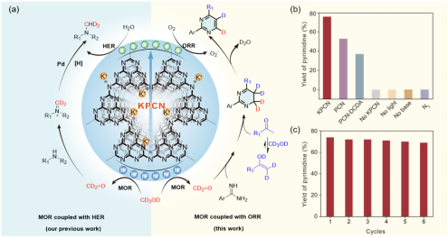 進一步的實驗研究表明該多組分環化策略具有官能團兼容性良好、底物普適性較高、催化劑穩定性高等優點,且適用于氘代嘧啶類分子的合成。克級規模的流動相光合成驗證了該方法的可放大性和實用性。該研究表明了半導體光催化劑在以甲醇為C1合成子的復雜分子構建中具顯著優勢,為未來人工光合成復雜生物活性分子奠定了基礎。