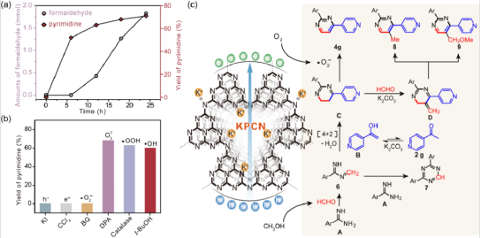 近日,Science Bulletin雜志在線發表了深圳大學微納光電子學研究院蘇陳良教授團隊的研究成果,該研究團隊以鉀摻雜聚合物氮化碳為半導體光催化劑,在光激發下利用光生空穴氧化活化甲醇生成甲醛,并以瞇為甲醛的捕獲劑,進行[3+1]縮合反應,生成二亞胺中間體。該中間體與烯醇原位發生[4+2]環加成反應構建了六元雜環中間體,并與還原端產生的活性氧發生氧化芳構化反應,得到目標嘧啶類分子(圖1)。