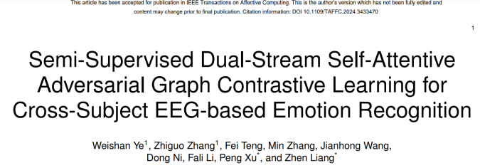 近日,醫(yī)學部生物醫(yī)學工程學院教授梁臻在情感計算頂級期刊IEEE Transactions on Affective Computing(影響因子9.6)上發(fā)表題為“Semi-Supervised Dual-Stream Self-Attentive Adversarial Graph Contrastive Learning for Cross-Subject EEG-based Emotion Recognition”的學術論文。深圳大學研究生葉煒珊同學和哈爾濱工業(yè)大學(深圳)張治國教授為共同第一作者,深圳大學副教授梁臻和電子科技大學教授徐鵬為共同通訊作者。深圳大學為第一作者單位和通訊單位。