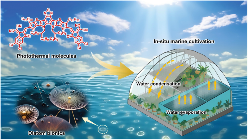 成果四:在全球人口快速增長和經濟持續發展的背景下,耕地和淡水資源的短缺已經成為我們生活中日益嚴重的問題。太陽能驅動的界面水蒸發技術,利用太陽能界面集熱的方式實現海水淡化,是最有希望獲得高質量淡水的方法之一。近年來,科研人員在光熱材料設計合成、太陽能蒸發器結構調控方面展開研究,不斷提高蒸發器的蒸發速率和太陽能-蒸汽轉換效率。其中,基于有機分子的光熱蒸發體系以其質輕、低廉及結構可調等特點受到關注,然而在面向實際應用中面臨著捕光效率低、循環性能差、易氧化失效等問題。基于此,我們提出了利用仿生界面的獨特結構和潤濕性配合有機共軛分子,實現高效捕光和循環穩定的光熱海水淡化策略,研究結果為低成本、制備簡易、抗鹽耐用的太陽能蒸發系統和海上農業提供了新的思路。研究人員受水生硅藻的啟發,通過簡單的有機合成方法得到光熱共軛分子,將光熱分子負載到了低成本的木漿海綿纖維基材上,分別構建了具有水面下懸浮機制的蒸發器。在一個標準太陽光下,蒸發器的太陽能-蒸汽轉換效率超過了88%,并且蒸發器的太陽能水蒸發效率最高達到1.62 kg m?2 h?1,這是目前基于純有機分子蒸發器的最高效率之一。