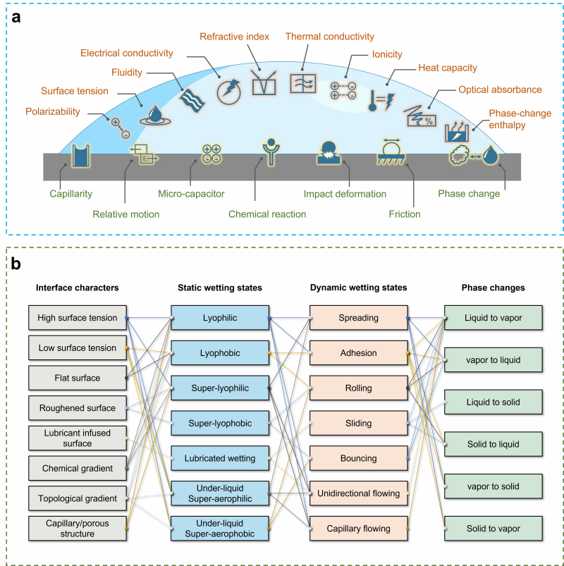 成果一:從材料、機理、結構、應用等方面抽絲剝繭,系統總結了在潤濕界面上電、光、熱能量和信號傳輸的優化與調控,聚焦于界面潤濕調控和界面結構設計的角度,深入討論了濕伏發電、液滴摩擦電、光子晶體、自清潔、太陽光熱蒸發、液滴冷凝等與潤濕界面調控結合的意義、原理和方法,并詳細介紹了其在綠色發電、傳感、防偽、防霧、人體熱管理、海水淡化等領域的應用。