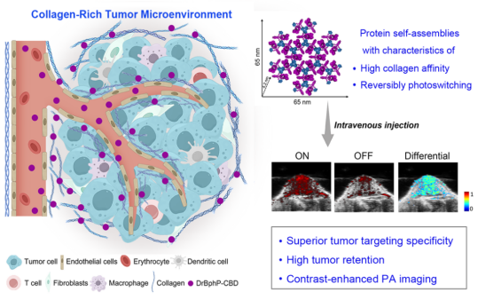可逆光開關蛋白探針的光致變色特性有助于消除多余的背景噪聲,尤其適用于深部腫瘤PA成像。該團隊通過AlphaFold成功開發了一種基于可逆光開關蛋白的組裝體(DrBphP-CBD),該蛋白通過將極端嗜輻射菌(Deinococcus radiodurans)中的光敏模塊(DrBphP)與膠原結合域(CBD)進行基因融合并制備。這些蛋白組裝體的尺寸在100納米左右,由24個DrBphP二聚體和12個CBD三聚體組成,展示出24個蛋白亞基。該納米組裝體對膠原具有強親和力,以及顯著的光開關對比度,極大地提升了PA成像的對比度。在多種小鼠腫瘤模型中,通過靜脈注射DrBphP-CBD,該組裝體展現出優異的腫瘤靶向性,并表現出較長的腫瘤滯留時間。通過背景抑制PA成像技術,大大地減少了背景的噪音,顯著地提高了PA成像的對比度。研究結果表明DrBphP-CBD作為光聲對比劑展現出的高特異性和優越的光開關對比度,有望在未來的臨床應用中提升光聲成像技術的診斷精度,推動癌癥早期檢測和治療監測的進一步發展。