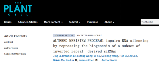2024年11月6日,生科院劉琳副教授課題組與北京大學(xué)陳雪梅院士團(tuán)隊(duì)合作在Nature Index期刊The Plant Cell(1區(qū)TOP,影響因子10.0)在線發(fā)表題為“ALTERED MERISTEM PROGRAM1 impairs RNA silencing through repressing the biogenesis of a subset of inverted repeats-derived siRNAs in Arabidopsis研究論文,揭示了AMP1和AGO1調(diào)節(jié)反向重復(fù)序列衍生的siRNA生物發(fā)生的新機(jī)制。
