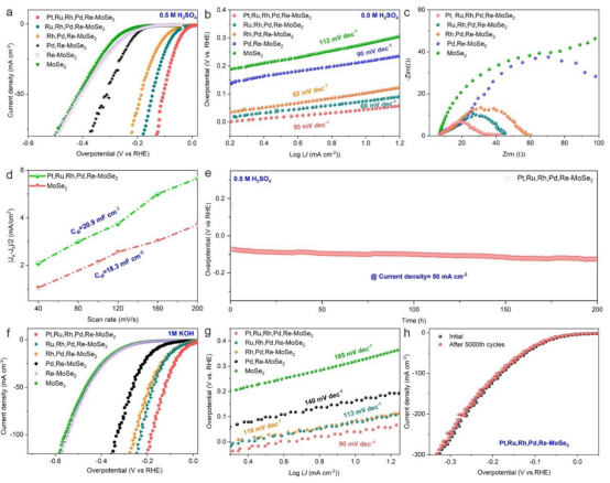 在本研究中,作者通過一種襯底介導的SAs形成策略,成功地在MoS2和MoSe2載體上制備了多金屬SAs和HESAs的文庫,可以精確地控制SAS的摻雜位置。特別是,SAs的含量可以不斷增加,直到TMDS載體上可達的Mo原子完全被SAs取代,從而允許更高的金屬含量。深入的機理研究表明,通過控制TMDS/TM離子界面上發生的可逆氧化還原反應,實現了多金屬SAS和HESA的良好控制合成。作為概念驗證的應用,各種SAs-TMDs被應用于析氫反應。優化的HESA-TMDs(Pt、Ru、Rh、Pd、Re-MoSe2)比最先進的鉑具有更高的活性和耐用性。因此,本研究工作將拓寬單原子催化劑的家族,為合理設計高性能的單原子催化劑提供新的指導。