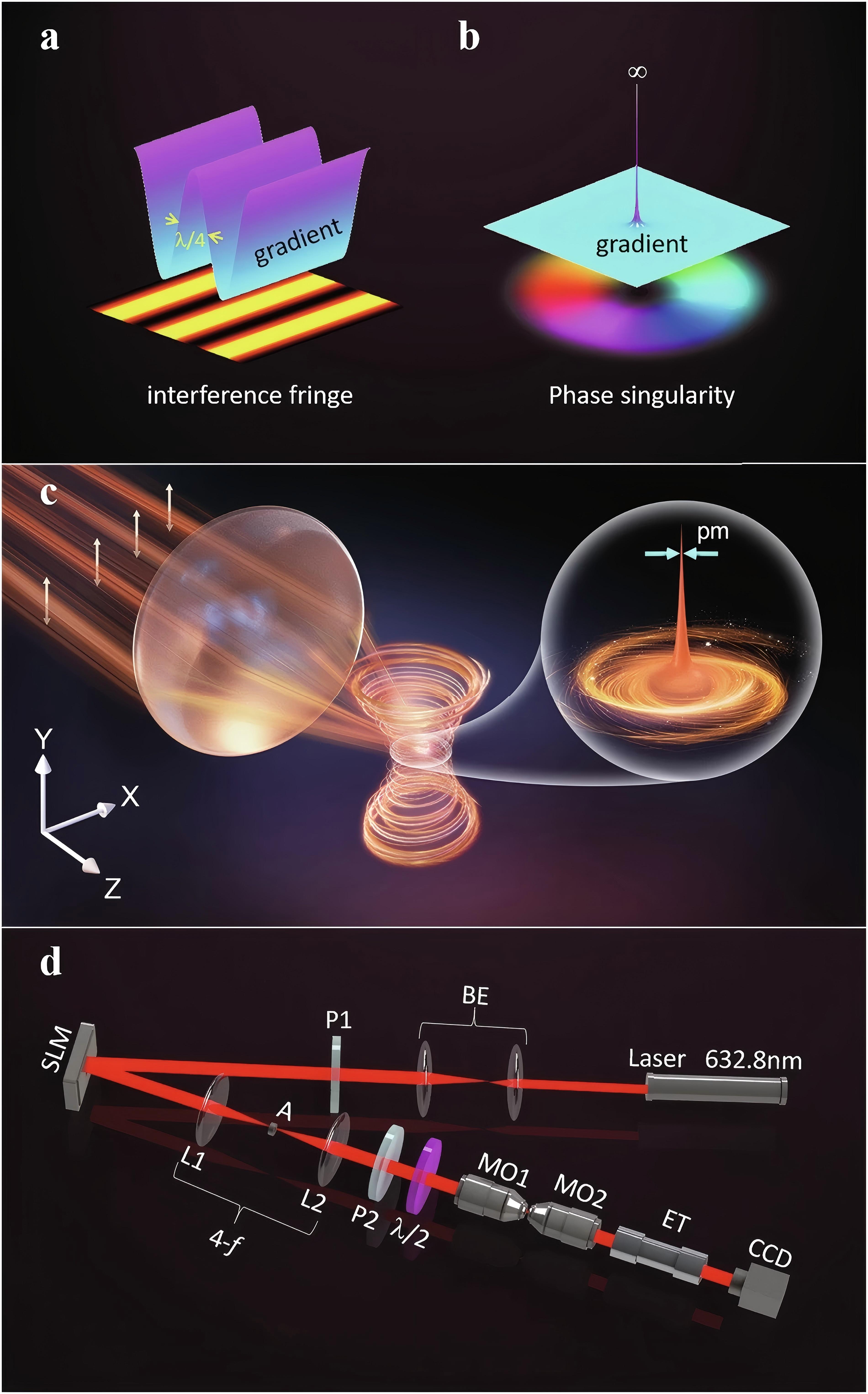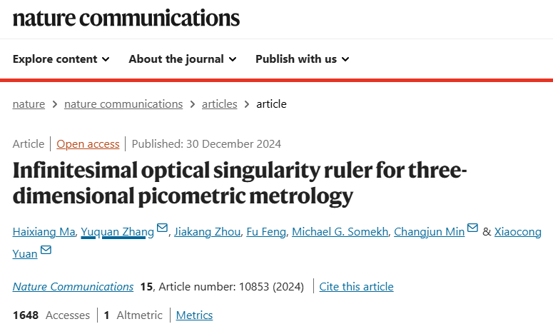 近日,由深圳大學(xué)講席教授、歐洲科學(xué)院院士袁小聰領(lǐng)導(dǎo)的深圳大學(xué)納米光子學(xué)研究中心,在皮米光子學(xué)領(lǐng)域取得了重要原創(chuàng)成果。研究團(tuán)隊(duì)提出了一種基于軌道角動(dòng)量(OAM)的新型奇點(diǎn)光學(xué)尺,成功實(shí)現(xiàn)了皮米級(jí)位移高精度測(cè)量,并在Nature Communications上發(fā)表了題為《Infinitesimal optical singularity ruler for three-dimensional picometric metrology》文章。該中心博士研究生馬海祥為第一作者,副教授張聿全、教授閔長(zhǎng)俊、教授袁小聰為共同通訊作者,深圳大學(xué)為該文章的第一單位和第一通訊單位。