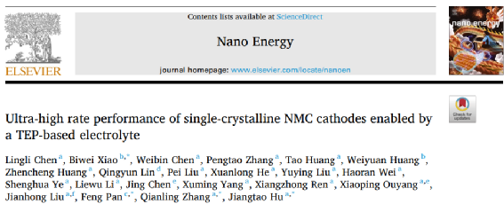 2. 深圳大學化學與環境工程學院張黔玲教授團隊在材料領域頂尖期刊Nano Energy(影響因子16.8,中科院JCR 1區)發表了題為“Ultra-high rate performance of single-crystalline NMC cathodes enabled by a TEP-based electrolyte”的研究論文。該團隊碩士研究生陳伶俐為論文第一作者,張黔玲、胡江濤、北京大學潘鋒教授、有研(廣東)新材料技術研究院肖必威教授為該論文通訊作者,深圳大學為第一作者單位和第一通訊單位。