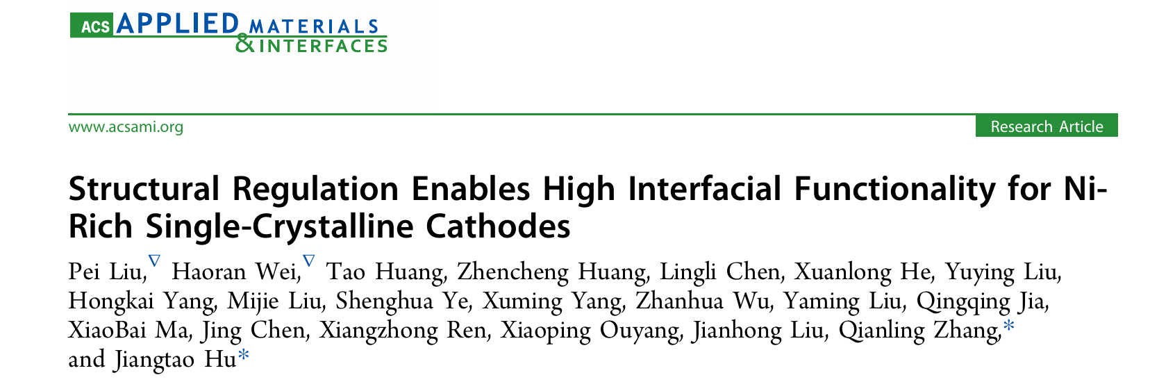 7. 深圳大學化學與環境工程學院張黔玲教授團隊在期刊ACS Applied Materials & Interfaces(影響因子8.3,中科院JCR2區,TOP期刊)上發表了題為“Structural Regulation Enables High Interfacial Functionality for Ni-Rich Single-Crystalline Cathodes”的論文。該團隊碩士研究生劉珮和魏浩然為共同第一作者,張黔玲和胡江濤為共同通訊作者。深圳大學為唯一作者單位和唯一通訊單位。