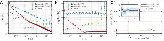 圖2 貝葉斯冷原子磁力計的性能。(A) 不確定度與總探測時間的標度;(B) 靈敏度與總探測時間的標度;(C)頻次測量與貝葉斯測量跟隨階梯變化磁場的追蹤圖。
