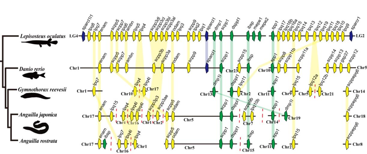 鰻鱺目魚類在進化過程中,體表無鱗或有極少且退化的鱗片。鰻鱺目和其它具有正常鱗片的硬骨魚類之間,存在某些參與鱗片形成的基因差異。其中,SCPP基因家族編碼一系列富含P/Q的分泌型鈣結合磷蛋白,參與骨骼礦化以及牙齒和鱗片形成。研究結果表明,鰻鱺目魚類的SCPP基因數目明顯較少(圖4),推測某些特定SCPP基因的缺失可能與鰻鱺目魚類鱗片極度減少現象相關。總之,本研究為鰻鱺目魚類染色體核型及體型進化的分子機制提供了新見解。
