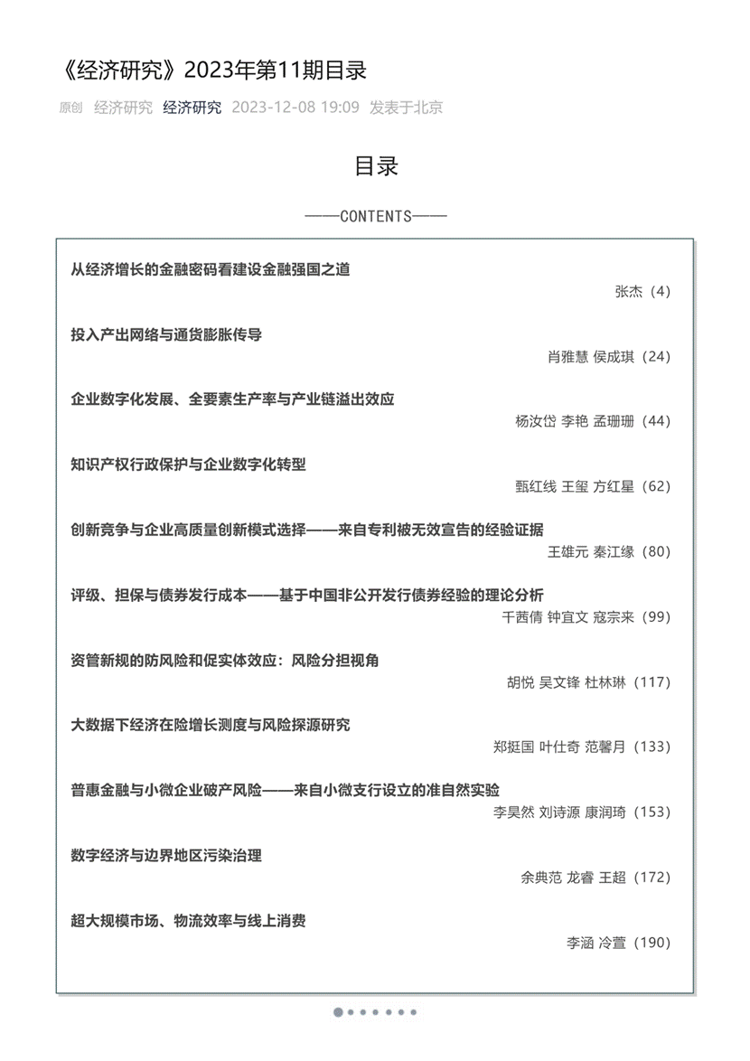 期刊簡介:《經濟研究》創辦于1955年,是全國性綜合經濟理論期刊,由中國社會科學院經濟研究所主辦、中國社會科學院主管,2022年影響因子為20.579,是國內各高校、研究機構公認的影響力最高的經濟學頂級期刊,也是我校經濟學目錄中的中文頂級學術期刊。