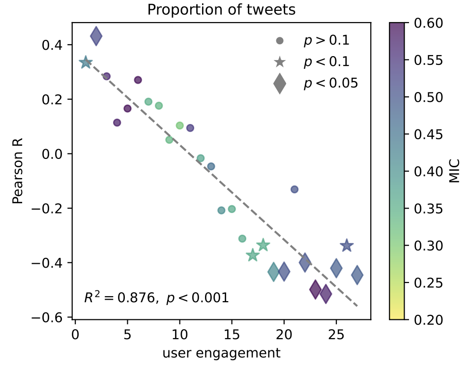 子群體轉發比例的演變與整體轉發趨勢之間的關系,說明參與度越低的子群體在面對外部沖擊時表現出更高的敏感度。其中,顏色表示MIC系數,而Pearson相關系數的統計顯著性則通過標記表示。虛線代表用于擬合Pearson相關系數結果的OLS線性回歸線,R2= 0.876,p < 0.001。