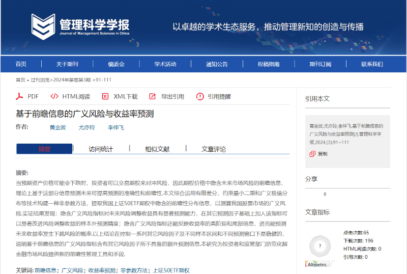 經(jīng)濟學(xué)院金融系教授黃金波等的論文“基于前瞻信息的廣義風險與收益率預(yù)測”在《管理科學(xué)學(xué)報》2024年第3期正式發(fā)表。《管理科學(xué)學(xué)報》由國家自然科學(xué)基金委員會管理科學(xué)部與天津大學(xué)共同主辦,是國家自然科學(xué)基金委管理科學(xué)部認定的A類重要期刊,入選中國科協(xié)“FMS管理科學(xué)高質(zhì)量T1級中文期刊”,在管理科學(xué)領(lǐng)域享有極高的學(xué)術(shù)聲譽。該文由深圳大學(xué)經(jīng)濟學(xué)院黃金波教授、對外經(jīng)濟貿(mào)易大學(xué)尤亦玲博士生和南方科技大學(xué)李仲飛講席教授合作完成,深圳大學(xué)經(jīng)濟學(xué)院為第一完成單位。