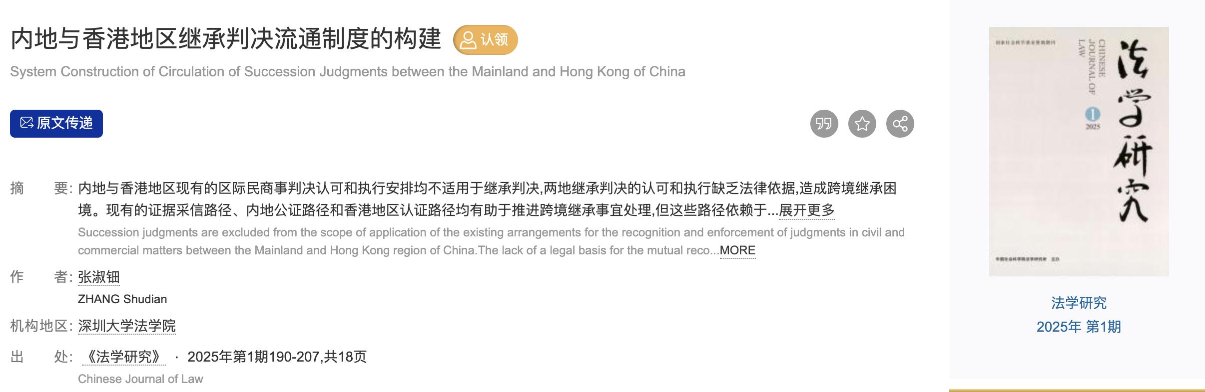 關鍵詞:區際私法;繼承判決;判決認可和執行;判決流通