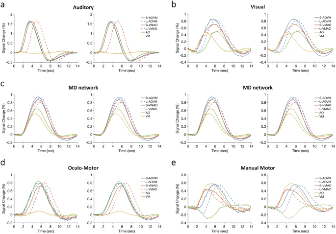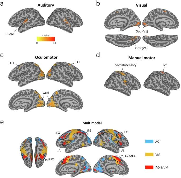 研究采用經典的心理不應期實驗范式,其中兩個任務分別為根據不同聲音做出眼動反應和根據不同顏色做出手指按鍵反應(圖1a-c)。在行為上,研究者觀察到經典的心理不應期效應,即在雙任務重疊(干擾)條件下,對第二個任務的反應被顯著推遲,反映出在雙任務條件下的序列加工模式(圖1d, e)。對單任務腦激活數據進行分析,研究者定位出了不同加工階段的腦區/網絡,其中包括在兩個任務中模態特異的聽覺感知、視覺感知腦區和眼動、手指運動腦區,以及多模態的中央加工腦區。該中央加工腦區和之前為研究者所熟知的支持完成多重任務需求的網絡高度重合(圖2)。